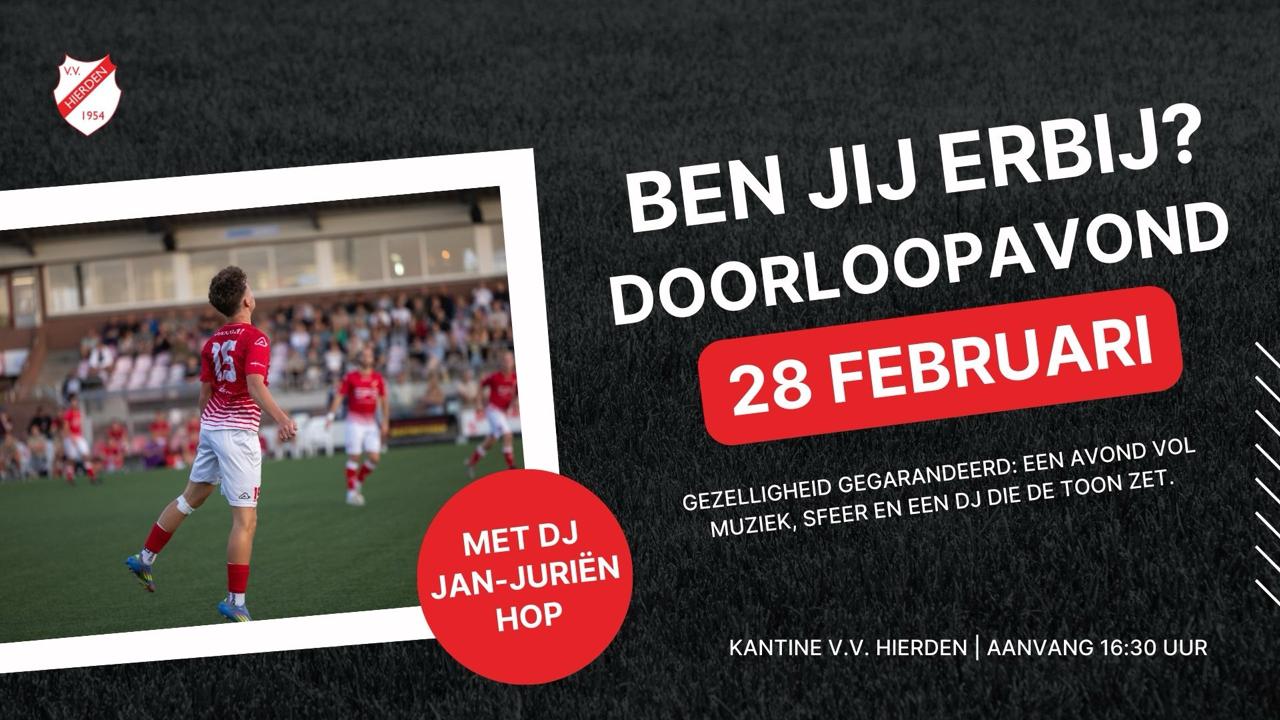 Na het laatste fluitsignaal is het nog lang niet voorbij bij v.v. Hierden! Op zaterdag 28 februari ben je van harte welkom in de kantine van v.v. Hierden voor een gezellige doorloopavond.