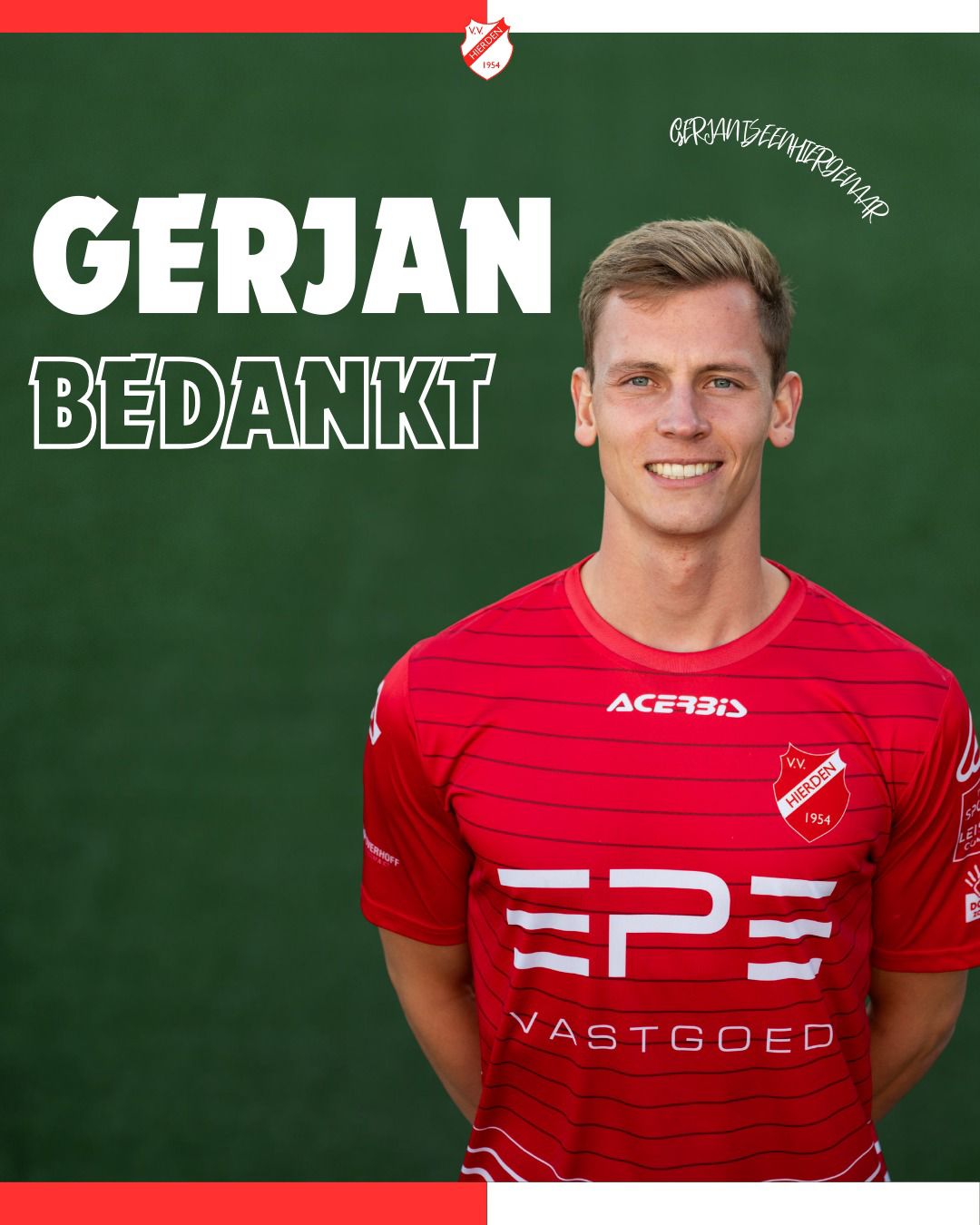 Gerjan: 'v.v. Hierden is een geweldige club met een prettige cultuur en een fantastische achterban. Ik ben hier destijds naartoe gekomen om mezelf uit te dagen en te ontdekken waar mijn plafond lag. Gevoelsmatig heb ik dat bereikt. Ik kijk terug op drie prachtige seizoenen, met als absoluut hoogtepunt het kampioensjaar 2023-2024!
