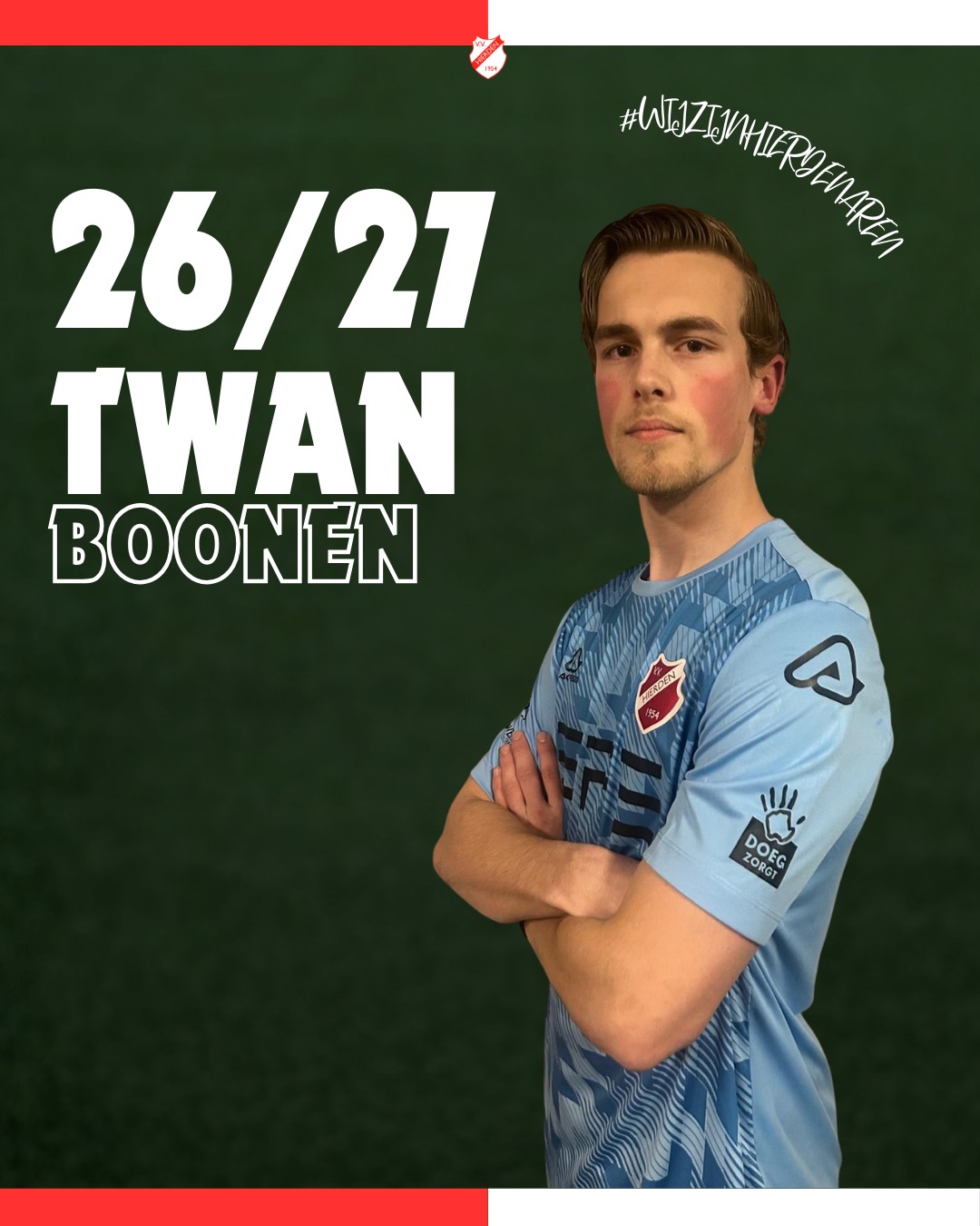Twan: ‘v.v. Hierden voelt voor mij nog altijd als thuis. Ik heb hier mooie herinneringen uit mijn jeugd en ben trots dat ik nu mag terugkeren in de selectie. Ik wil mezelf blijven ontwikkelen en zie v.v. Hierden daarin als ideale vervolg stap. Ook wel lekker dat ik weer op mijn fietsje naar het voetbalveld kan! Tot volgend jaar!’